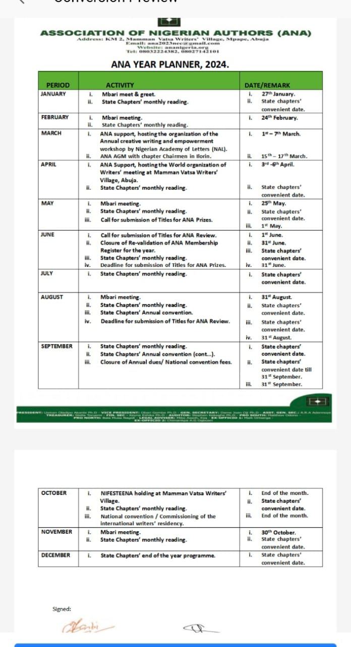 Published: 14th Aug. 2024ANA NATIONAL/CHAPTERS YEARLY CALENDAR AND ACTIVITIES