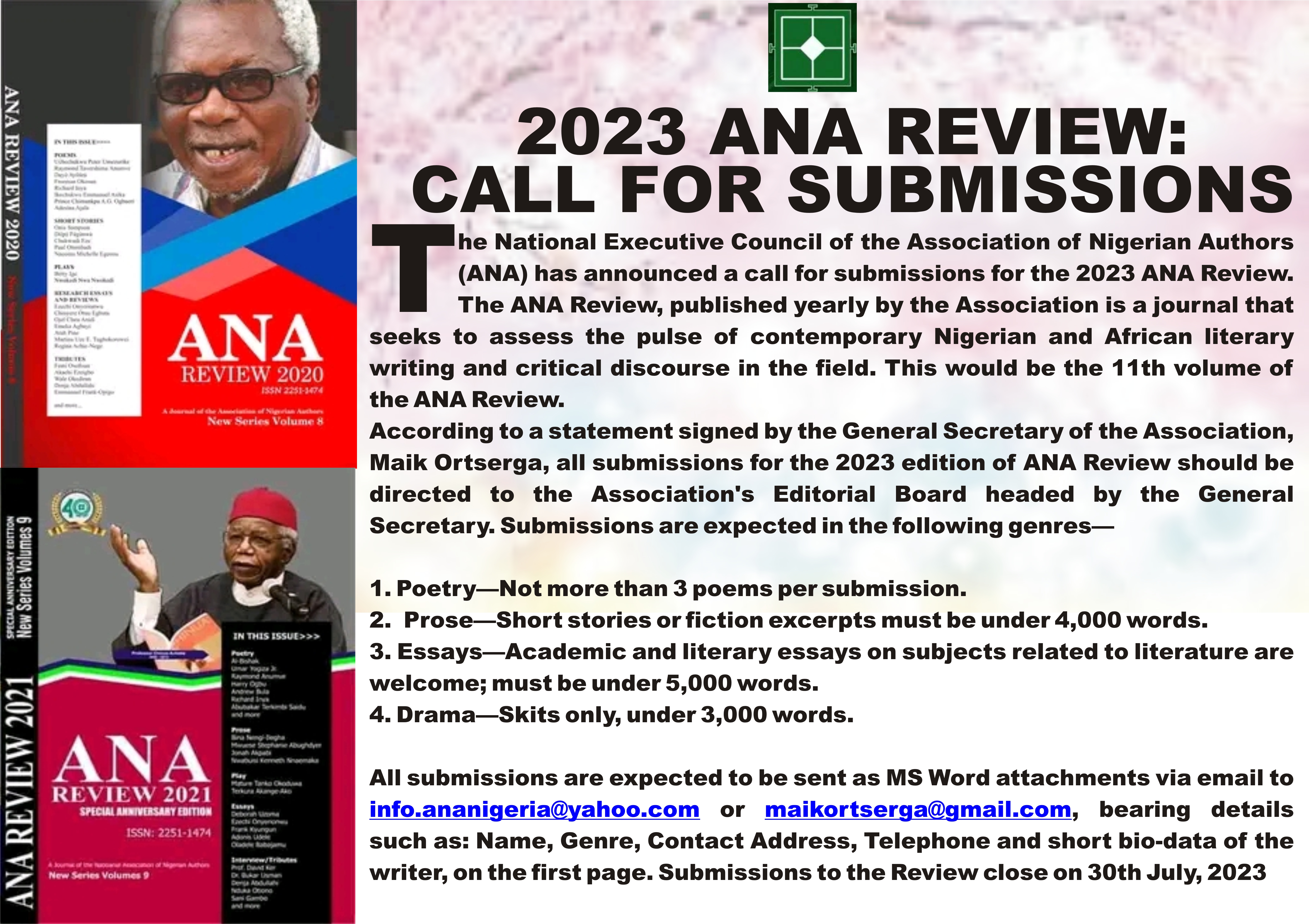 Published: 25th Apr. 20232023 ANA LITERARY PRIZES: CALL FOR ENTRIES