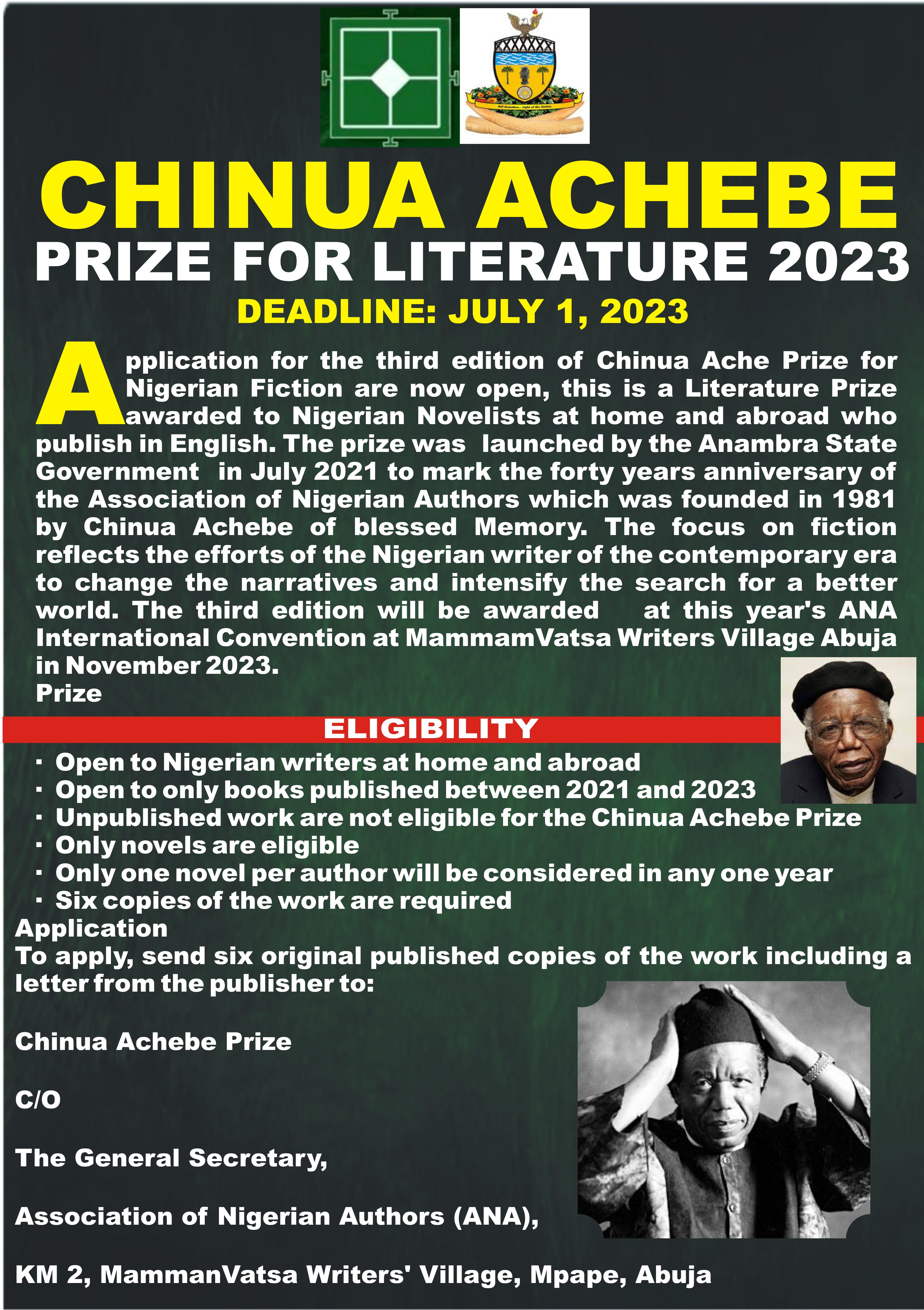 Published: 25th Apr. 2023CALL FOR ENTRIES: CHINUA ACHEBE PRIZE FOR LITERATURE 2023