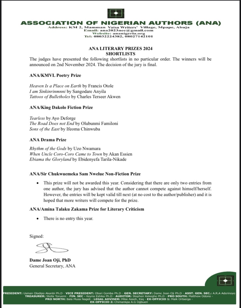 Published: 25th Aug. 2024ANA LITERARY PRIZES 2024 SHORTLISTS